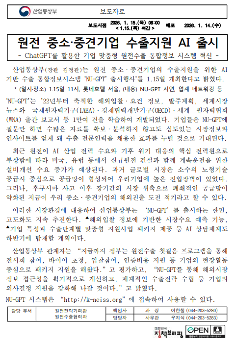- 011415석간원전수출협력과, 원전 중소·중견기업 수출지원 AI 출시.pdf (266.4K) 0회 다운로드 | DATE : 2026-01-15 10:40:28
